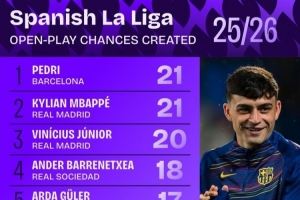 体育资讯10月16日讯 日前,Squawka统计了本赛季西甲运动战创造机会排行,